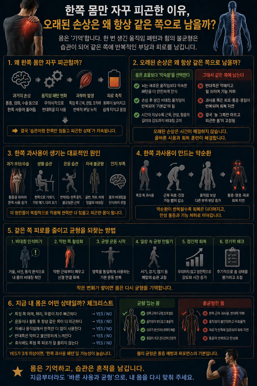 운동을 많이 하지 않았는데도 유독 한쪽 몸만 먼저 피곤한 날이 있다. 같은 자세로 서 있어도 한쪽 허벅지가 먼저 당기고, 양팔을 같이 써도 특정 어깨만 빨리 무거워진다. 심지어 특별히 통증이 없는 날에도 몸이 한쪽으로 더 많이 지치는 느낌이 반복되면 “왜 항상 같은 쪽일까?” 하는 생각이 들게 된다. 정형외과와 재활운동 분야에서는 이런 현상을 오래된 손상 이후 남는 비대칭 패턴으로 설명한다. 몸은 한 번 다친 쪽을 오래 기억한다. 통증이 줄어든 뒤에도 체중 분산, 힘 쓰는 순서, 작은 근육 반응 속도가 이전과 완전히 같아지지 않기 때문이다. 특히 회전근개 손상, 반월상연골 수술, 허리디스크처럼 시간이 오래 지난 손상은 겉으로 괜찮아 보여도 특정 방향 반응 차이가 남는다. 나 역시 양쪽 회전근 파열을 겪었지만 실제 피로감은 특정 날 한쪽이 더 분명했고, 반월상연골 수술 이후에는 우측 허벅지 피로가 지금도 먼저 올라온다. 허리디스크가 있는 날은 그 차이가 더 크게 느껴진다. 그래서 통증보다 “왜 항상 같은 쪽이 먼저 지치는가”를 더 자주 보게 됐다. 이 글에서는 왜 한쪽 몸만 자꾸 피곤한지, 오래된 손상이 왜 같은 방향으로 남는지, 그리고 실제 경험 속 비대칭 변화가 어떤 의미였는지를 정리해본다.