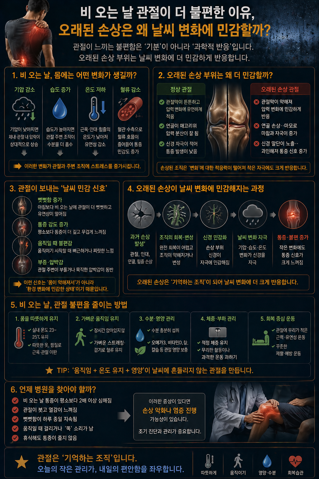 비가 오기 전이나 흐린 날이 되면 특별히 무리하지 않았는데도 어깨가 무겁고, 무릎은 평소보다 묵직하며 허리까지 둔하게 불편한 날이 있다. 많은 사람이 “날씨 때문인가?” 하고 말하지만 실제로는 왜 그런지 정확히 알기 어렵다. 정형외과와 재활운동 분야에서는 이런 변화를 단순 기분 탓으로 보지 않는다. 특히 오래된 회전근개 손상, 반월상연골 수술, 허리디스크처럼 한 번 구조적 자극을 겪은 부위는 기압과 체온 변화에 더 예민하게 반응할 수 있다고 설명한다. 관절 주변 조직은 외부 환경 변화에 따라 미세하게 긴장도가 달라지고, 이미 회복된 부위라도 작은 부종감이나 긴장 증가가 생기면 평소보다 움직임이 둔해진다. 나 역시 양쪽 회전근 파열 이후 비 오는 날에는 팔이 더 무겁고, 무릎 수술 이후에는 우측 허벅지 피로와 무릎 안쪽 묵직함이 먼저 느껴지는 날이 있었다. 허리디스크가 있는 날과 겹치면 몸 전체가 평소보다 둔하게 움직였다. 그래서 날씨 변화는 단순 심리보다 몸의 반응 차이로 느껴졌다. 이 글에서는 왜 비 오는 날 관절이 더 불편한지, 오래된 손상이 왜 날씨에 민감한지, 그리고 실제 경험 속에서 어떤 변화가 반복됐는지를 정리해본다.