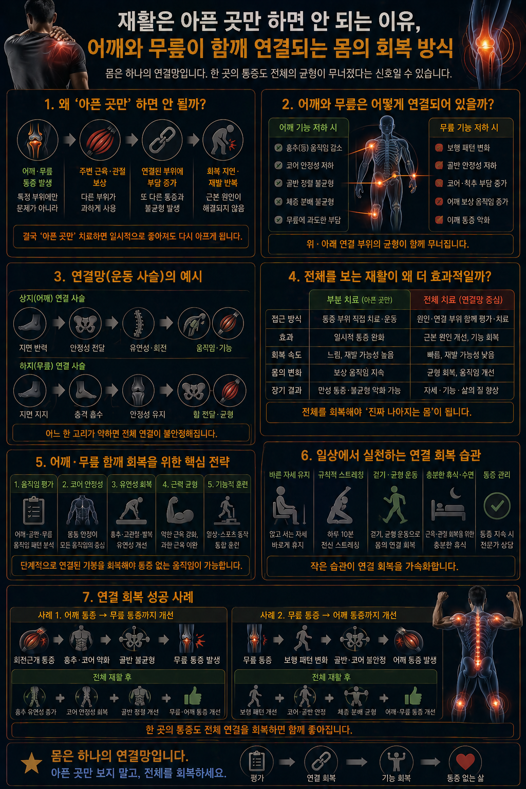 재활을 시작하면 대부분 가장 아픈 부위에만 집중하게 된다. 어깨가 불편하면 어깨 운동만 하고, 무릎이 아프면 허벅지 운동만 반복한다. 처음에는 당연한 접근처럼 보이지만 시간이 지나도 기대만큼 회복되지 않거나 같은 불편함이 반복되면 “왜 운동을 하는데 그대로일까?” 하는 생각이 들게 된다. 정형외과와 재활운동 분야에서는 이때 가장 먼저 보는 것이 연결된 움직임이다. 몸은 한 부위만 따로 움직이지 않기 때문이다. 어깨는 목과 등, 견갑골과 함께 움직이고, 무릎은 골반과 허리, 발까지 연결돼 힘을 나눈다. 그래서 특정 부위만 운동하면 일시적으로 좋아져도 다시 같은 패턴이 반복될 수 있다. 나 역시 양쪽 회전근 파열 이후 오랫동안 어깨 자체만 문제라고 생각했다. 중학생 때 다쳤을 당시에는 주사치료와 자연치유 중심이었고, 시간이 지나도 어깨가 끝까지 자연스럽게 올라가지 않는 날이 많았다. 그런데 주변 근육을 풀고 등 움직임을 같이 만들었을 때 오히려 어깨가 더 부드럽게 움직였다. 무릎도 마찬가지였다. 반월상연골 완전 파열 수술 이후 우측 허벅지 차이가 남아 있는데, 시간이 지나면서 허리디스크가 있는 날 무릎 피로가 더 빨라지는 것을 분명히 느꼈다. 그래서 지금은 아픈 부위만 보는 방식으로는 부족하다는 것을 더 확실히 알게 됐다. 이 글에서는 왜 재활은 아픈 곳만 하면 안 되는지, 어깨와 무릎이 실제로 어떻게 연결돼 회복하는지, 그리고 실제 경험 속 변화가 어떤 의미였는지를 정리해본다.