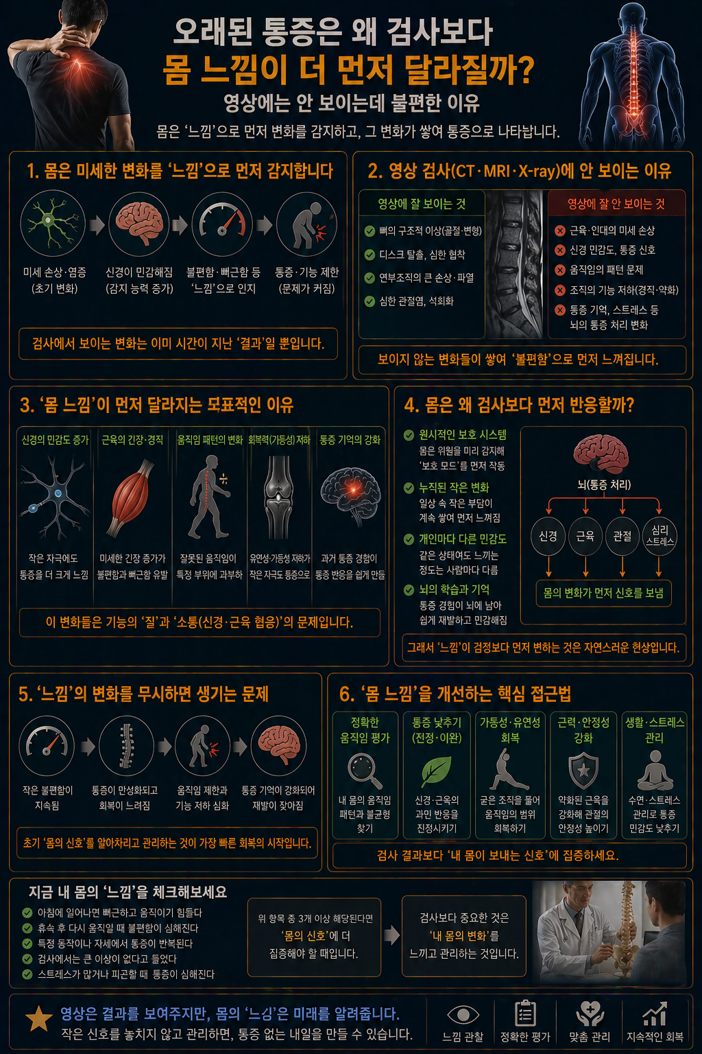 스포츠재활에서는 몸 느낌을 단순 불안으로 보지 않는다. 오히려 회복 상태를 읽는 중요한 정보로 본다. 내 경우 어깨는 주변 근육을 풀면 바로 움직임이 달라진다. 무릎도 허벅지 긴장을 낮추면 오래 서 있는 피로가 덜하다. 즉, 몸 느낌은 구조 악화보다 현재 컨디션 차이를 더 잘 보여준다. 전문가들이 영상 결과만 보지 않고 움직임 검사와 촉진을 같이 하는 이유도 여기에 있다. 오래된 통증은 검사보다 몸 느낌이 먼저 달라질 수 있다. 그래서 몸이 보내는 작은 차이를 읽는 것이 회복 유지에 훨씬 중요하다.