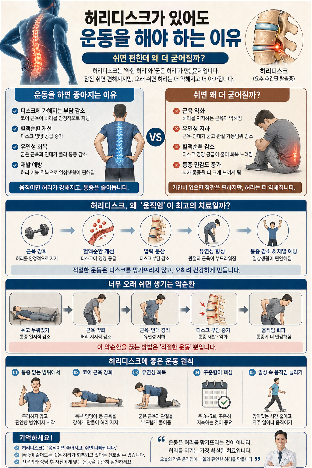 허리가 불편한 날에는 가장 먼저 눕고 싶어진다. 움직이면 더 아플 것 같고, 조금만 오래 서 있어도 허리 안쪽이 묵직해지기 때문에 가만히 쉬는 것이 가장 안전하게 느껴진다. 실제로 허리디스크가 처음 불편할 때는 움직임보다 휴식이 먼저 필요할 때도 있다. 하지만 시간이 지나도 계속 쉬기만 하면 이상하게 몸은 더 무거워지고, 허리뿐 아니라 어깨와 무릎까지 같이 둔해지는 날이 늘어난다. 정형외과와 재활운동 분야에서는 허리디스크 관리에서 완전한 휴식보다 적절한 움직임 유지가 더 중요하다고 설명한다. 디스크 자체는 구조 문제이지만, 그 주변을 지지하는 근육과 움직임 패턴은 사용하지 않으면 더 빨리 굳기 때문이다. 특히 오래 앉거나 같은 자세를 오래 유지하면 허리 주변 깊은 근육 반응이 더 느려지고, 몸은 점점 허리를 덜 쓰는 방향으로 적응한다. 나 역시 허리디스크가 있으면서 몸 전체 피로가 달라지는 것을 자주 느꼈다. 허리가 무거운 날은 우측 무릎 허벅지가 더 빨리 피곤했고, 양쪽 회전근 손상이 있는 어깨도 같이 무거웠다. 반대로 무리하지 않는 선에서 몸을 풀고 움직인 날은 허리보다 전체 몸 흐름이 더 가벼웠다. 그래서 지금은 허리가 불편할수록 무조건 쉬는 것이 항상 답은 아니라는 것을 더 분명히 느낀다. 이 글에서는 허리디스크가 있어도 운동을 해야 하는 이유, 쉬면 편한데 왜 오히려 더 굳는지, 그리고 실제 경험 속 몸의 반응을 정리해본다.