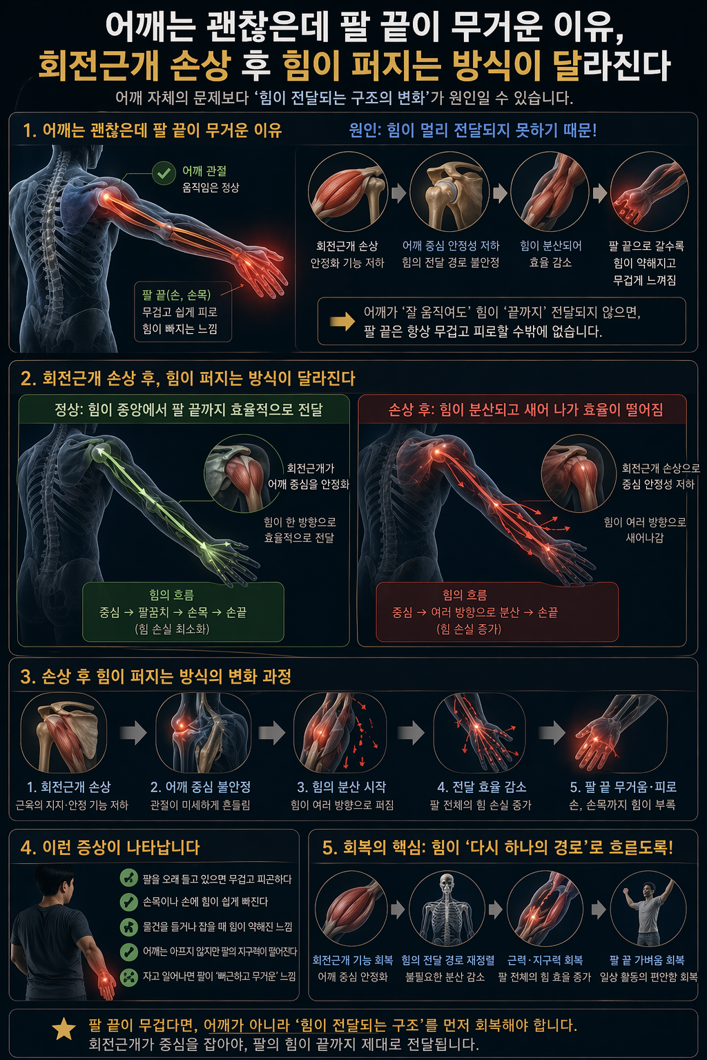 어깨 자체는 크게 아프지 않은데 팔 끝이 유난히 무겁게 느껴지는 날이 있다. 물건을 오래 들고 있으면 손목보다 먼저 팔 전체가 묵직해지고, 머리 위로 팔을 들면 어깨보다 팔 끝으로 피로가 먼저 내려온다. 이런 느낌은 단순 근육 피로처럼 보이지만 실제로는 어깨에서 시작된 힘 전달 방식 변화와 연결되는 경우가 많다. 특히 회전근개 손상 경험이 있거나 오래된 어깨 부상 후 후유증이 남아 있는 사람은 통증보다 이런 무거움이 더 자주 나타난다. 정형외과와 재활운동 분야에서는 회전근개를 단순히 어깨 근육으로 보지 않는다. 팔 전체 힘의 시작점을 안정시키는 깊은 조절 근육으로 설명한다. 즉, 어깨 안쪽에서 중심을 잡아주는 힘이 늦어지면 팔 아래쪽 근육들이 더 많은 일을 하게 된다. 그래서 어깨는 괜찮은데 팔 끝이 먼저 지친다. 나 역시 양쪽 회전근 파열 이후 통증보다 오히려 이런 묵직함을 더 오래 느꼈다. 중학생 때 다쳤을 당시에는 도수치료가 흔하지 않아 주사치료와 자연 회복 위주로 지나갔고, 시간이 지나며 팔은 움직이지만 힘이 퍼지는 방식은 완전히 같지 않다는 것을 느끼게 됐다. 특히 피곤한 날은 어깨보다 팔 아래쪽이 먼저 무거워졌다. 이 글에서는 왜 어깨는 괜찮은데 팔 끝이 무거운지, 회전근개 손상 이후 힘 전달이 어떻게 달라지는지, 그리고 실제 경험 속에서 어떤 차이가 남았는지를 정리해본다.